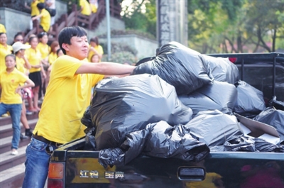 山上的蚊虫很多,许多穿短裤和裙子的队员,由于忙着捡垃圾,脚上被蚊子叮了很多红点。两个多小时过去了,百余名队员不言苦不怕脏不喊累,把潜山“翻了个遍”,个个满头大汗“满载而归”,将装得满满的垃圾袋放到车上,然后拖运到垃圾场。