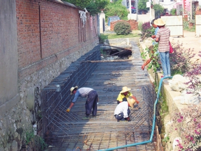 施工人员告诉记者,这条小水沟里杂草丛生,周边的污水都排在沟里,导致这条水沟臭气熏天,附近居民深受其扰,将它称之为“龙须沟”。前不久,有关部门对这条臭水沟进行整治,除掉了杂草,清除了淤泥。目前他们正在沟底铺水泥,扎钢筋,整修河道堤岸,不久后,这条臭水沟就将得到彻底治理。 (记者庞赟通讯员周瑞宁)