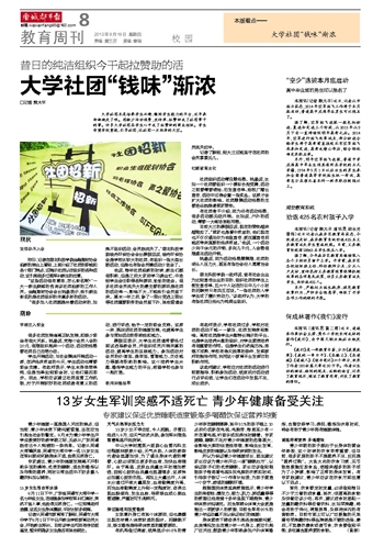 大学社团本是培养学生兴趣、锻炼学生能力的平台,近年来却渐渐走了味。因缺少活动经费,发传单、拉赞助成了社团常干的事。许多大学社团在学生心中成了拉赞助的商业组织。学生希望学校重视、引导社团,还社团一片纯净的天空。