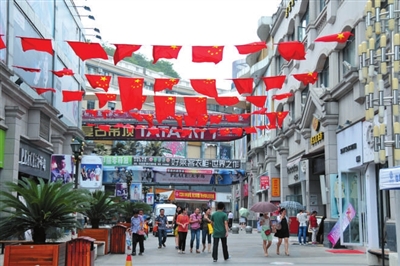 昨日,记者在市区看到,部分商家卖场门口的五星红旗飘扬,成为街头一道靓丽的风景,国庆节日气氛日渐浓烈。 (毛亚轩)
