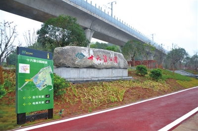 该绿道宽2.5米,分南北两段,总长3335米,与行车道同步规划、同步设计、同步建设,一次成型,成为我市绿道建设示范段。