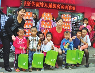 10月1日,咸安区北门口“洋袜袜”店前,同心幼儿园“向留守儿童赠送保暖内衣”的爱心活动在此举行。 据了解,此次赠送的品牌儿童保暖内衣共计100套,当地十所幼儿园的百名留守儿童受益。(见习记者袁昊通讯员陈大银)