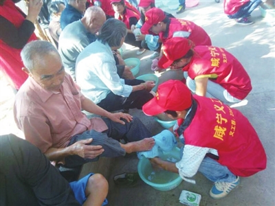 12日,咸宁义工一行50余人,带着千余元的物资来到咸安横沟福利院,开展“金秋重阳·我为老人洗洗脚”活动,陪老人们度过了一个别样的重阳节。