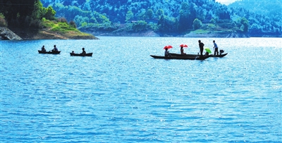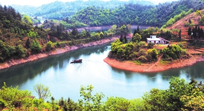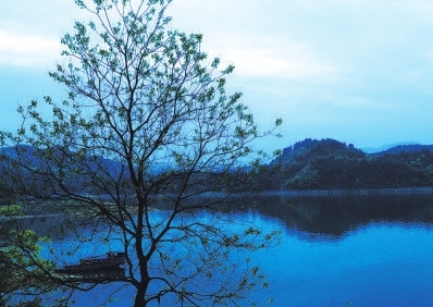 远望大溪湖,是安静的一潭碧水。如朴素的少女,静卧四面环山的山底,纯朴干净,没受任何污染。又如从天泄下浅绿的液态琉璃,与葱茏山色交相辉映,让一波波美轮美奂的绿,一层层,直逼眼帘。
