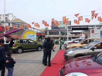19日下午5时许,记者在温泉城区中商百货附近看到,东风日产、通用别克、北京现代等多个品牌车型正在做小型车展。临近华中车展期间,在户外LED屏幕上记者也看到了本地车商在华中车展期间的促销信息。