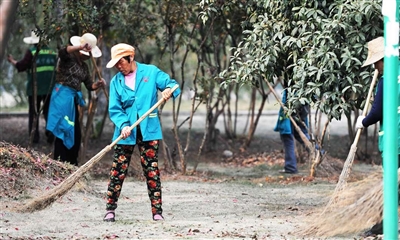 昨日,记者在市人民广场看到,秋意渐浓落叶满地纷飞,园林工人们正紧张的忙碌着清理绿化带的卫生,保证广场的清洁。赵骥/摄