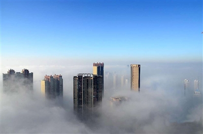 10月30日早晨,沈阳市气象局发布大雾橙色预警,沈阳市区出现能见度低于200米的浓雾。大批高楼在浓雾中只露出楼顶,宛若“空中楼阁”。 (据新华网)