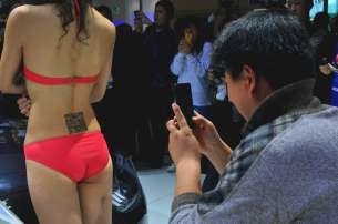 11月7日,第六届郑州国际车展在郑州国际会展中心开展期间,几名着比基尼车模亮相车展,身上敏感部位打上二维码来吸引前来观看车展的市民的眼球,博得市民纷纷拿起相机和手机扫描模特身上二维码。(网易)