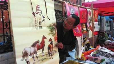 昨日,记者在温泉中心集贸市场附近发现,不少小摊点已开始销售马年挂历。在一家杂货店,商家的摊位上挂满了印有“马年祥和”、“马年送福”、“马到成功”、“一马当先”、“骏马雄风”等字样的挂历。