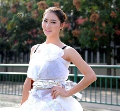 11月15日,湖北武汉市经济学院法商学院社团联合会举办的法商之星婚纱设计大赛上,25位“模特”身着3米卫生纸制作的创意设计婚纱行走校园,惊艳全场。(人民网)