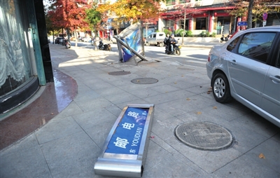 昨日,记者在城区邮电路路口看到,原本树立在路边的灯箱路牌,被撞得几乎散架,灯箱零件散落一地。据周边居民介绍,该路牌几天前的夜里被车子撞坏后,肇事者逃离了现场,目前还无人来修复。 赵骥/摄