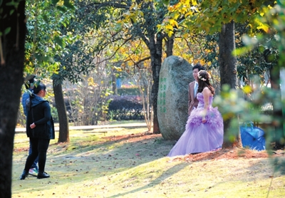 昨日太阳露出笑脸,不少人到户外享受暖阳。图为一对情侣趁晴好天气拍婚纱照。毛亚轩/摄