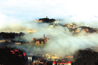 那大厦因云而生,缘雾而设,是龙之宫。一绺雾是玉带,一团云是锦帐,缠住了从古至今的天地情,裹住了九宫山仙凡界的绝世情恋。朦胧处,有谁知九王子的婚期,有谁知陶姚妃子的踪影?高耸入云的塔尖,仰望雨滴的恩泽,一阵激动的泪雨,酿成云湖的浩淼,雁影云中掠过,翎落波光潋滟,化作桨楫,接走了多少期盼,多少梦想。