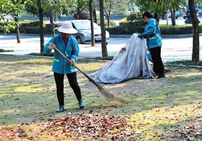 近日,寒风料峭,落叶缤纷,辛勤的环卫工人正在清扫落叶,保持公园的洁净。 毛亚轩/摄