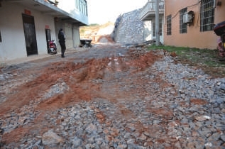 11月19日,记者来到天成家居商城,顺着商城旁的水泥路面向里走,便到了位于商城后面的居民区,张女士家便在这居民区内。据了解,这里住的便是杨下七组的村民。记者在现场看到,商城旁的水泥路仅修到居民区门前,而居民楼旁的路段则全是尘土,楼房之间的路段则是石子合着泥土铺垫所成,一旦下雨,这些路段则泥泞不堪,出行极为不便。张女士称,这里是杨下七组村民的还建点,她在此住有5年了,但这“泥巴路”却一直无人管。“这石子路还是村里见村民出行不便才铺的。”张女士说道。