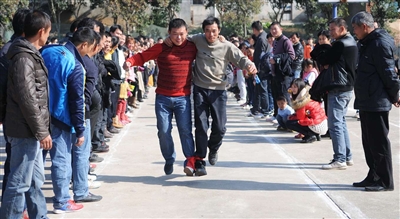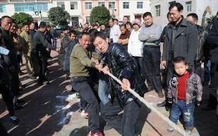 广场上,拔河比赛场面是最激动人心的,参赛队员卯足了劲用力拉,亲友团的助威声此起彼伏,每个村15名队员,此时,团队的力量尤为重要,有的代表队瞬间秒杀了对手,有的参赛队员拉得面红耳赤、汗流浃背,最终才赢得比赛,在满场的吆喝声中,比赛一浪高一浪。