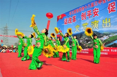 青山镇党委书记王雄伟说,此次以‘学习贯彻党的十八届三中全会精神,话改革、创平安、促和谐’为主题的大型文艺汇演的成功举办,是为了促进全镇各项工作推动,促进干群关系改善,促进农民幸福感的提升。引导农民健康向上,提高农民生活质量,有利农村家庭和睦共处。通过今年文化建设年的启动,进一步丰富农民精神生活,说到底,就是要农民健康地玩,幸福地活。