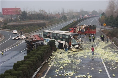 12月8日下午,京港澳高速公路湖北赤壁段发生一辆运输大白菜的大货车侧翻起火、引发了其他三车发生碰撞的交通事故,造成了双向通车受影响。高警咸宁大队民警迅速处置,很快恢复了通车秩序。 孔令生/摄