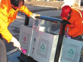 爱护环境卫生,建设美丽家园。连日来,温泉环卫处环卫工人在坚持保洁的同时,对街头的垃圾桶进行了清洗。 周阳吴江宏/摄
