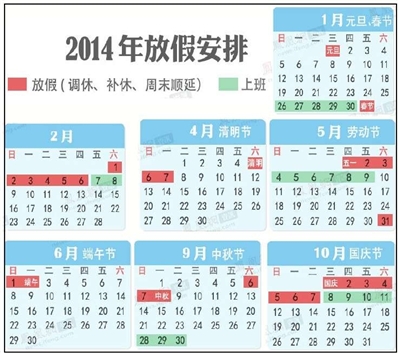 根据国务院新修订的《全国年节及纪念日放假办法》和国务院办公厅有关明年节假日安排通知,2014年元旦、春节、清明节、劳动节、端午节、中秋节和国庆节放假调休日期具体安排如下: