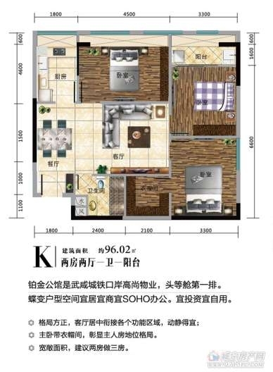 推荐户型:铂金公馆K户型户型类型:三房两厅一厨一卫户型面积:约96平方米推荐理由:铂金公馆位于龙潭转盘附近,距离武咸城际铁路咸宁南站几百米的路程。该户型是紧凑型的小户型,主卧、客卧、衣帽间、厨房、卫生间、阳台等一应俱全,可以满足居家生活需要,也可以成为一个中型的办公场所。