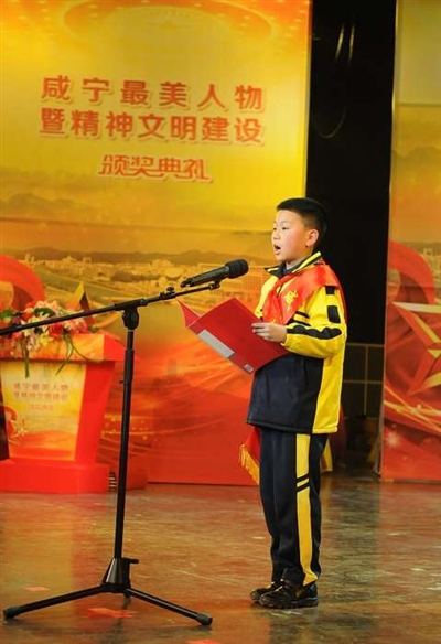 在颁奖典礼尾声,荣获“咸宁最美少年”称号的咸宁市实验小学学生丁丁宣读了《学习最美人物,争做咸宁好人》的倡议书,倡议更多人加入争做咸宁好人行列,让香城泉都人更美,城更香。