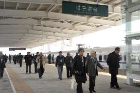 到了咸宁南站,也就到了咸宁市中心地带,体验团成员对于车站换乘情况十分关注。本报记者也受到武汉媒体同行的青睐,采访者络绎不绝。