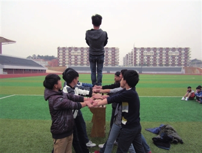 这是汽车运用工程系学生开展拓展训练的一个场景。带队老师告诉记者,活动的目的是要让倒下的学生充分感受到完全信任团队带来的无穷力量,通过攻破个人心理障碍,激发个人潜能,让大家体会信任与被信任的无穷力量,激发大家的团队意识。