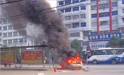 请30日上午8时20分许,在市区长安大道交警三大队公交站牌处,一辆银白色小轿车在调头过程突然发生自燃被烧毁。所幸车主及时离开,未发生人员伤亡,消防官兵随后赶到将火扑灭。(记者 周阳 方达星)