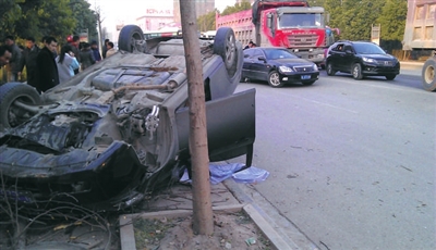 在距离黑色本田轿车10几米远的人行道上,有一条2米多长的车轮痕迹。从现场痕迹上看,这辆汽车是斜着“飞”上人行道后出现了整体翻倒的现象。在飞上人行道时,汽车还撞断了2棵行道树,其中被撞的第一棵是连根拔起,第二棵则被拦腰斩断。本田轿车的旁边满是尘土和汽车碎片,其中汽车的右前轮也被撞断倒在一边,车辆前半部分受损严重。
