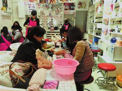 在春节前给自己做个漂亮的指甲成了不少时尚女士的选择。昨日,记者在温泉城区中辉国际广场二楼几家专业美甲店看到,前来做美甲的女士明显增多,小小美甲店里热闹非凡,美甲师们忙得不亦乐乎。