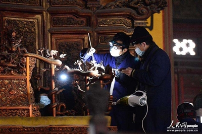 而金漆雕龙宝座——“龙椅”,今天也迎来了十年来的首次彻底保养。记者今天上午在现场看到,工作人员拿着软毛刷和吸尘器,对其表面的尘土进行细心地擦洗,部分角落甚至用上了棉签,让“龙椅”恢复其金光灿灿的原貌。