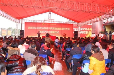 本报讯 1月11日,“武汉市汉正街市场与咸安商贸物流区签约大会暨咸宁义乌授牌仪式”活动及“汉正街市场大团购,乐享跨年盛惠”团购活动正在咸宁义乌售楼处门口火热举行。 武汉市汉正街市场管理委员会相关领导、汉正街市场总商会会长、执行会长、咸安商贸物流区管委会相关领导,以及汉正街金正茂商会、汉正街鞋业商会等20多家商会领导出席了授牌仪式。