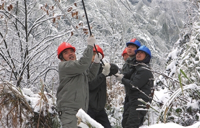 雨雪天气给我市供电带来严峻考验。10日,咸宁供电公司员工在咸安区汀泗桥镇星星村抢修被冰雪损毁的10千伏配电线路。 邓东峰/摄