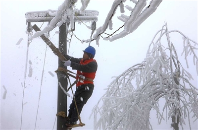 18日,咸宁供电公司共产党员服务队顶风冒雪在崇阳县金塘镇正源村抢修配电线路,确保革命老区乡亲们的生活用电。日前我市降雪,导致海拔800米以上山区的配电线路覆冰。咸宁供电公司30余支共产党员服务队一马当先,深入高寒山区巡查输配电线路,及时排除隐患,确保山区百姓可靠供电。 邓东峰/摄