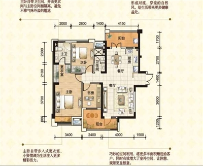 该户型是南北双阳台设计,能有效的形成对流,带来穿堂风。双阳台的设计,也让客厅通透。