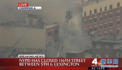 事发后大约10辆消防车赶到现场扑救,倒塌的建筑物砖石散落在道路上,当地电视画面显示,东哈莱姆区上空升起浓烟。