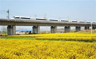 阳春三月绿满天,油菜花黄把色添。随着气温逐渐回暖,在咸安区官埠桥镇金灿灿的油菜花把田间地头装扮成了一片花的海洋,一列武广动车从中穿行,构成一幅秀美的田园风光。 赵忠志/摄