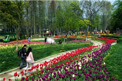 郁金香外形典雅、色彩纯正、花色繁多,绚丽多变,被誉为“花中皇后”,观赏过郁金香的人常常被它丰富而饱满的色彩所陶醉。武汉植物园引进了100多个品种的郁金香涵盖了红、粉、白、黄、紫、绿、黑、橙、蓝等10多种单色、白黄、红黄、红紫、白绿、黄绿等30多种复色,颜色非常丰富。除了人们常见的红、黄、白郁金香,游客在武汉植物园还可以观赏到少见的蓝紫色郁金香“蓝钻石”,黑色郁金香“黑鹦鹉”“小黑人”“夜皇后”,绿色郁金香“绿色田野”“春绿”等。