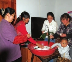 在汀泗桥镇大桥村和赛丰村,虽然四周崇山横绝,一条山路进出,但这几天村庄却热闹无比,因为村里至今还延续着每年农历2月中下旬家家做箬叶粑吃的习俗。贾志腾家也不例外,今年他特意把妻子刘育珍、媳妇蔡巧和隔壁邻舍叫来一起忙乎。