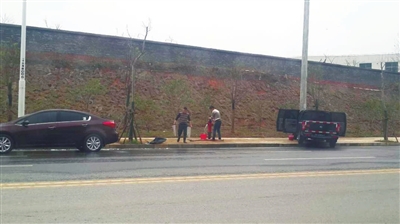 当天下午2:20分许,根据戴女士的指引,记者从黄畈路段城际铁路高架桥下往十六潭公园方向走,在路边看到了被占“便宜”的消防栓。只见消防栓龙头附近,放着一根冲洗车辆的高压水管。消防栓旁边,停着一辆皮卡车和一辆小轿车,两个车主正拎着水桶不断往车身上泼水,并用抹布进行擦拭。