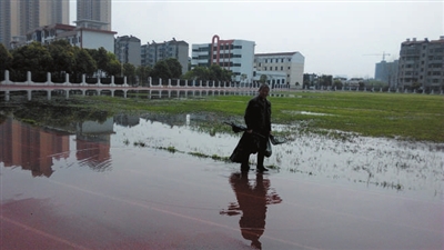 3月29日上午9时许,记者在咸安实验中小学校内大操场看到,经过头天一场大雨,学校操场内一片汪洋,大片的塑胶跑道浸泡在水中。