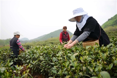 昨日,咸宁市柏墩生甡川砖茶厂茶园基地内,茶农正在采摘茶叶。据悉,茶叶是我市农业的主要支柱产业,到2013年底,全市茶叶总面积25.41万亩,总产量2.5万吨,实现综合产值30.35亿元。 (程昌宗/摄)
