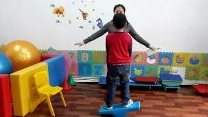 同样有喧闹声传出的,还有康复中心的感觉综合训练室。推开门后发现,热闹与这群孩子也无多大的关系。用心在那里蹦跳,教孩子们玩各类康复训练器材的,是老师们。 5岁的乐乐(化名)在老师的陪伴下,玩着滑滑梯,可是神情漠然,和旁边的同龄小朋友也没有任何交流;7岁的进进(化名)在老师的陪伴下练习平衡板,嘴里不停地念着,似乎很开心。当记者去打招呼时,他看也不看。