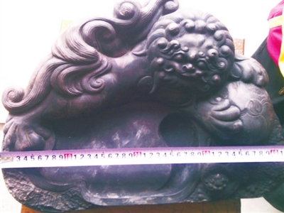 记者看到,这方砚台呈黑色,砚台上有两只抱着绣球的狮子。砚台古朴大方,上方的狮子造型栩栩如生。记者用卷尺一量,砚台长有40余厘米,宽有32厘米,高有9.5厘米。