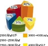在3月所销售的住宅中,2000元/㎡以下占比9%、2000-2500元/㎡占比11%、2500-3000元/㎡占比33%、3000-4000元/㎡占比40%、4000元/㎡以上占比7%。其中2500元/㎡以下住宅占比率较2月上涨7%。