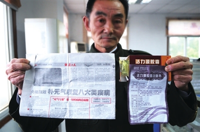 昨日上午,记者看到了胡爹爹在街头拿到那份广告宣传单,广告单上写的是“医药健康报”。记者注意到,该份报纸第二版左侧写着:活力源胶囊可从根源上治疗风湿、类风湿等各类骨病。胡爹爹告诉记者,他正是看到了这个广告才去药店买了此药。
