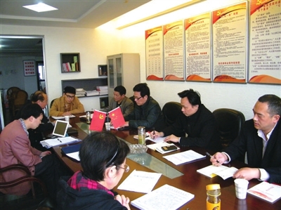 在党的群众路线教育实践活动中,市律协温泉律师党支部针对律师行业特点,聚焦“四风”查问题,要求律师党员要树立宗旨意识,强化服务理念,在办案中要坚持抵制阴暗面,防止腐败,维护司法公平公正,发挥律师党员模范带头作用。图为4月24日,该支部律师党员在集中学习。 杨剑/摄
