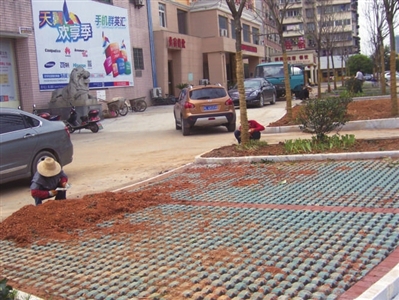昨天,记者在赤壁电信大楼前看到,园林施工人员正在对该大楼前的绿化带进行草坪砖改造施工。 (记者艾菊桂)