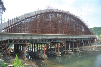 近日,记者在市区金桂路西段延伸工程的淦河桥施工现场看到,主桥上部彩虹形的拱梁已完成,整个大桥已显雏形。